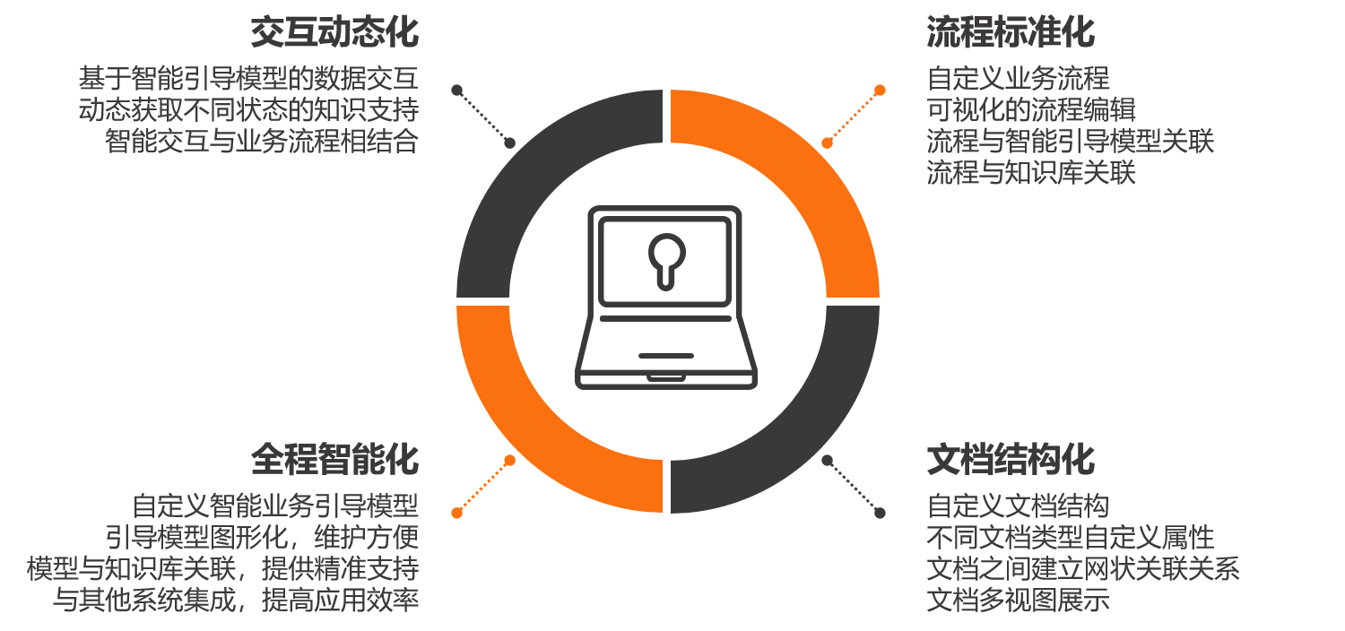 知识权限管理、知识使用限管理、知识采集管理、智能引导模型管理、业务流程管理,为企业提供一个易用、安全、高效的结构化知识管理体系。